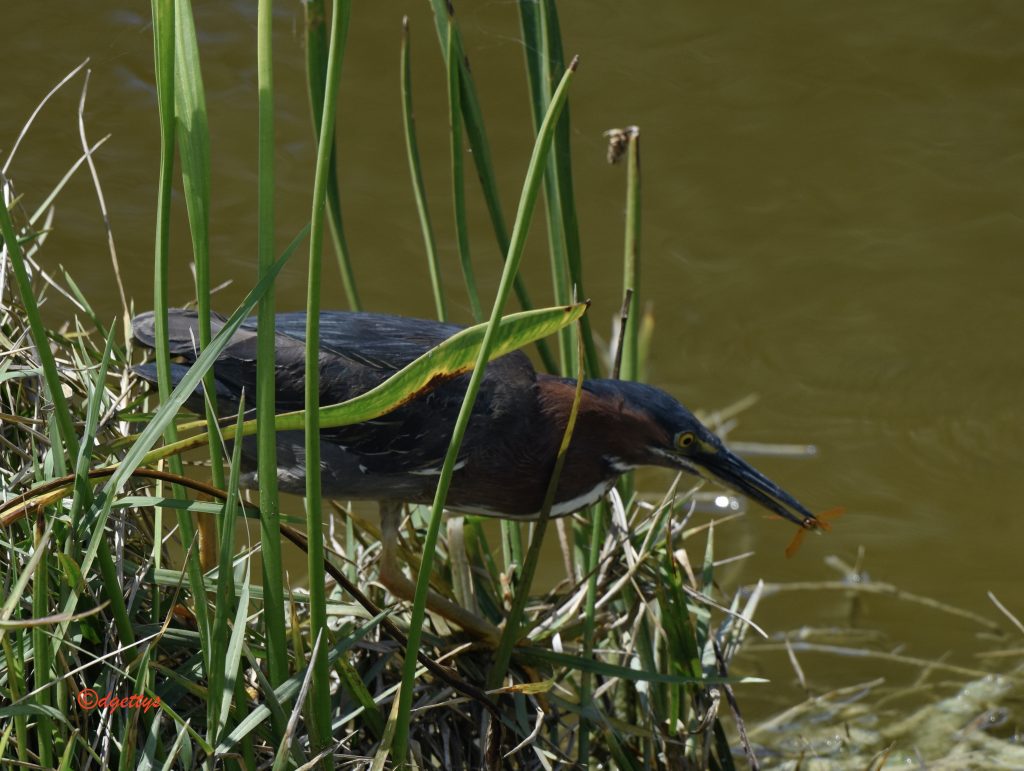 Green heron with red dragonfly he caught. North Port Florida