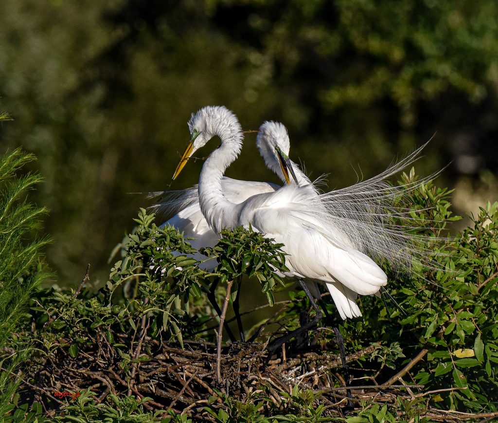 Pair of egrets nest building Venice Rookery Venice Florida